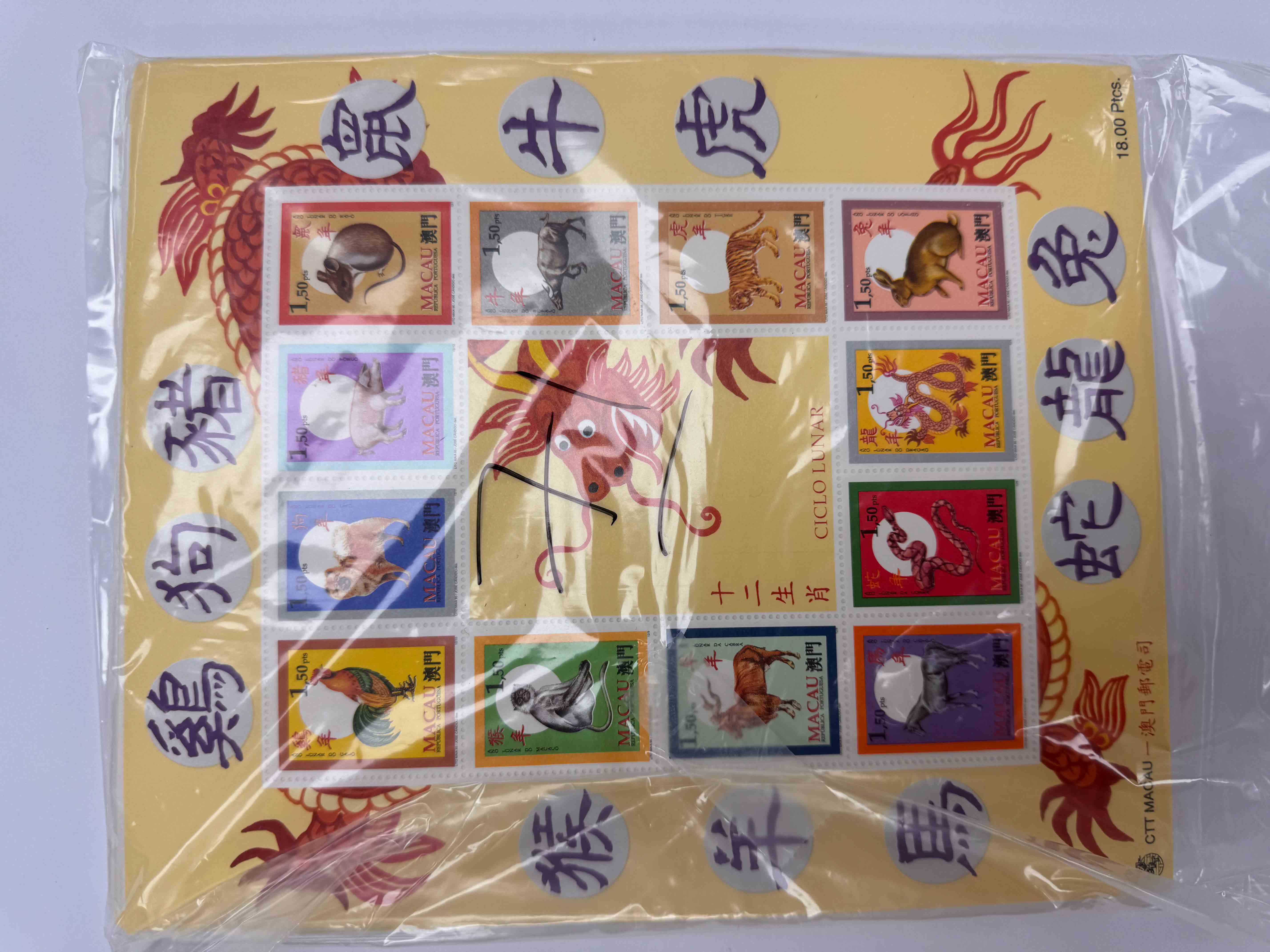 澳門十二生肖小全張71枚,總面值約$1,278。