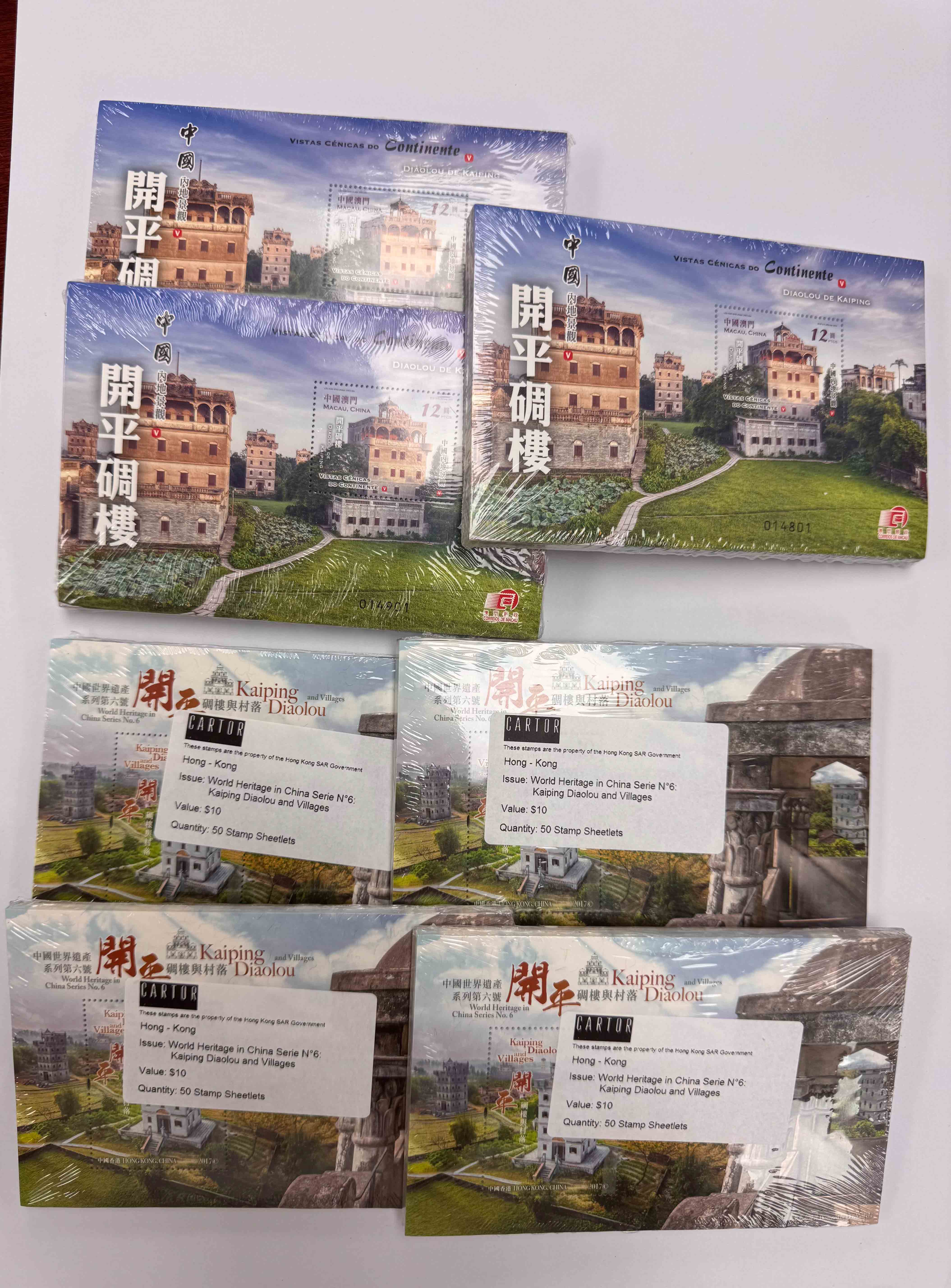 澳門開平碉樓小型張300枚及香港開平碉樓與村落小型張200枚,總面值約葡幣3,600 港幣2,000。