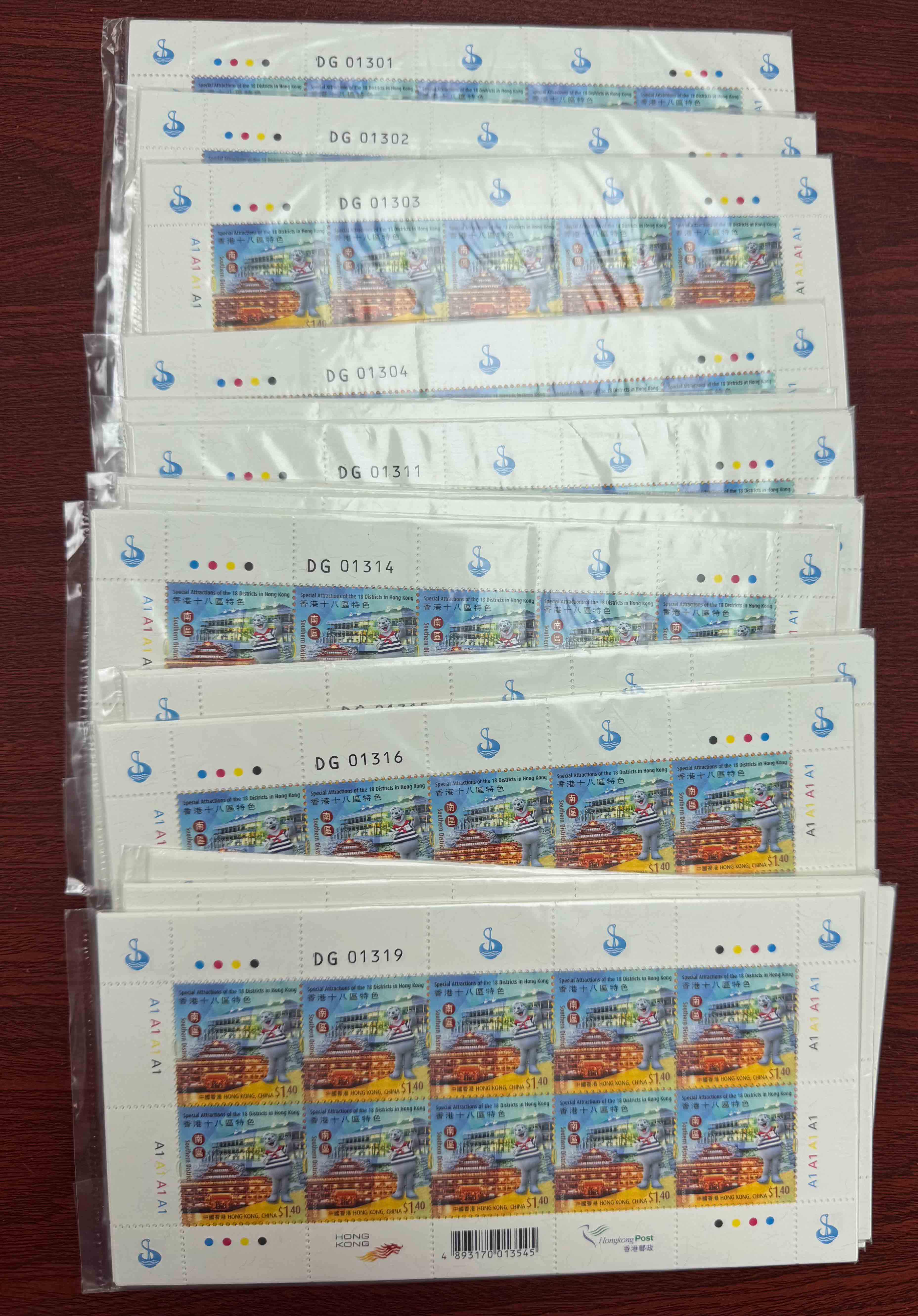 香港十八區特色小版張新全各15版,共150套,總面值約$3,780。
