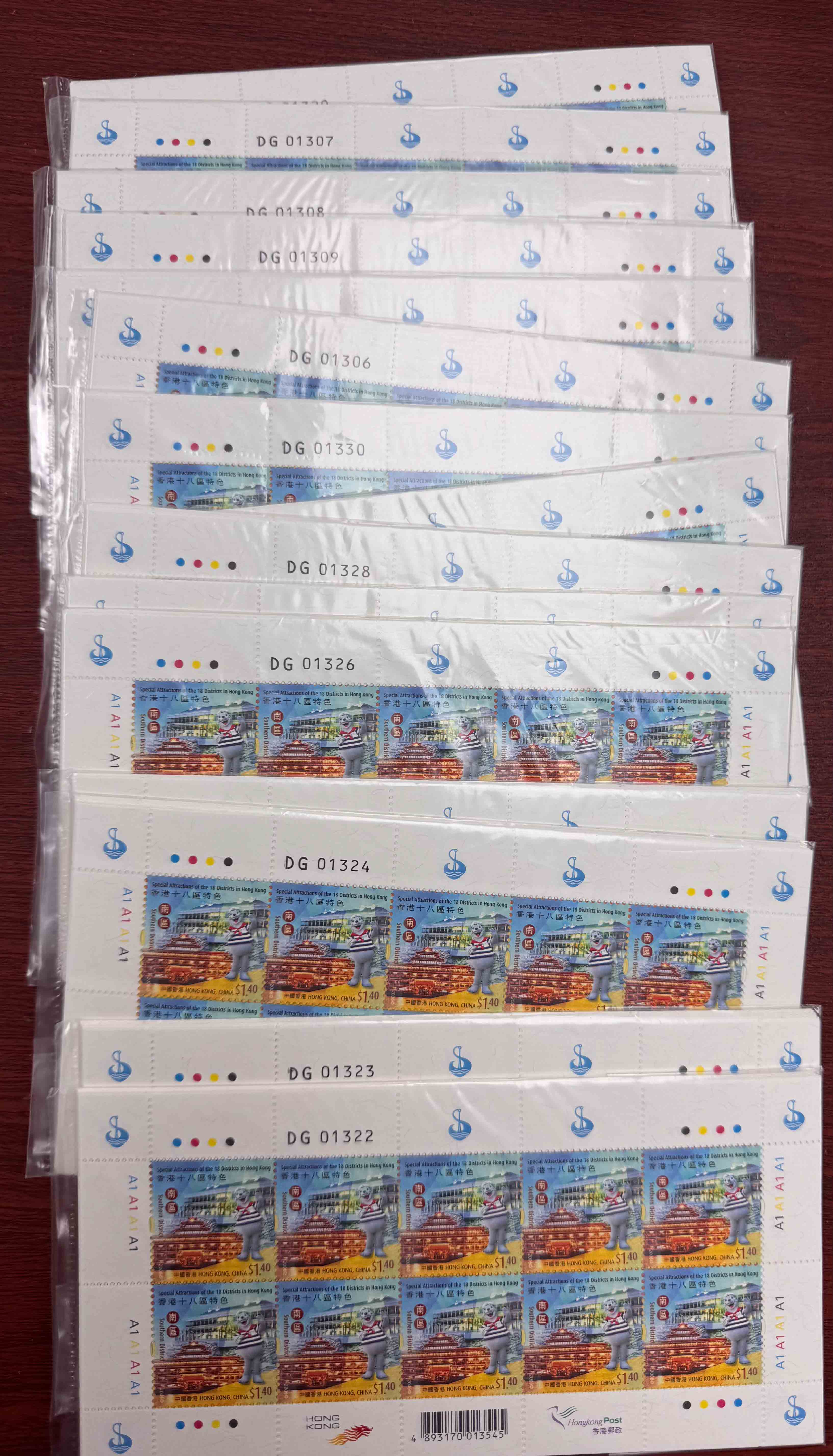 香港十八區特色小版張新全各15版,共150套,總面值約$3,780。