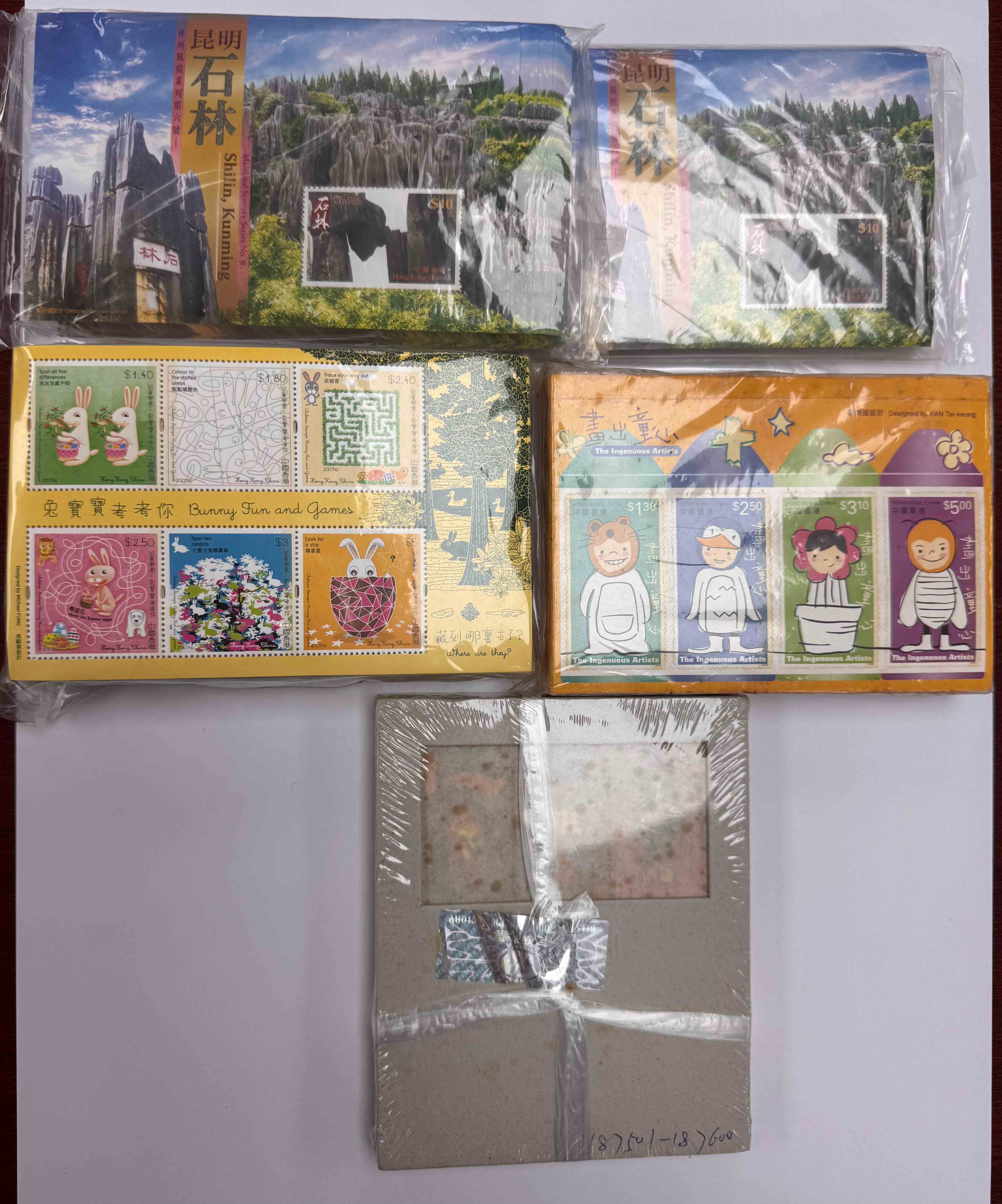 香港昆明石林10元面值小型張167枚、香港兔寶寶考你16.1元面值小型張200枚、畫出同心(有黃)11.9元面值100枚及民間燈彩11.2元面值小全張100枚,總面值約$7,200。