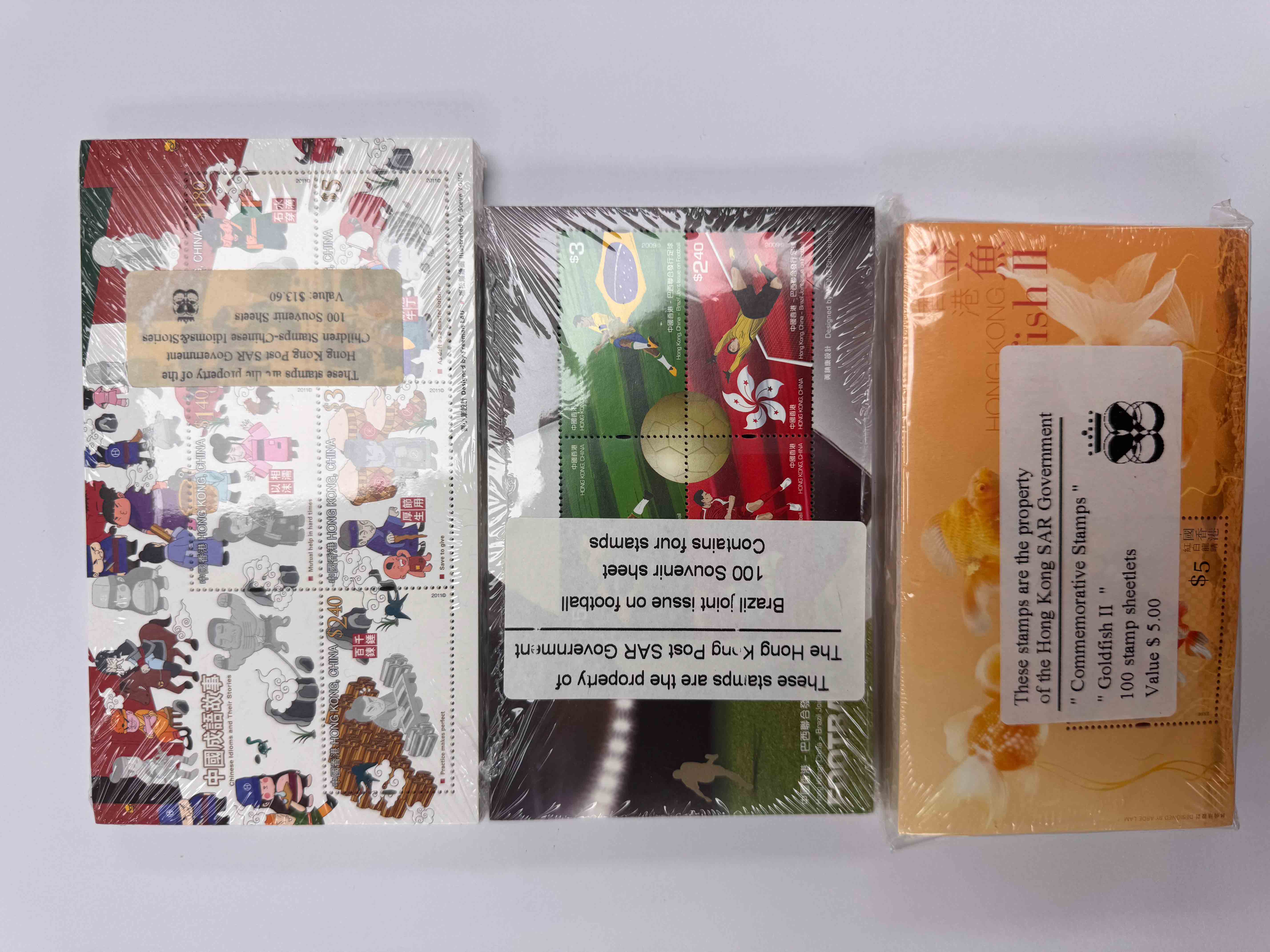 香港金魚二版5元面值小型張、香港巴西聯合發行足球11.8面值小型張及中國成語故事11.2面值各100枚,總面值約$2,800。