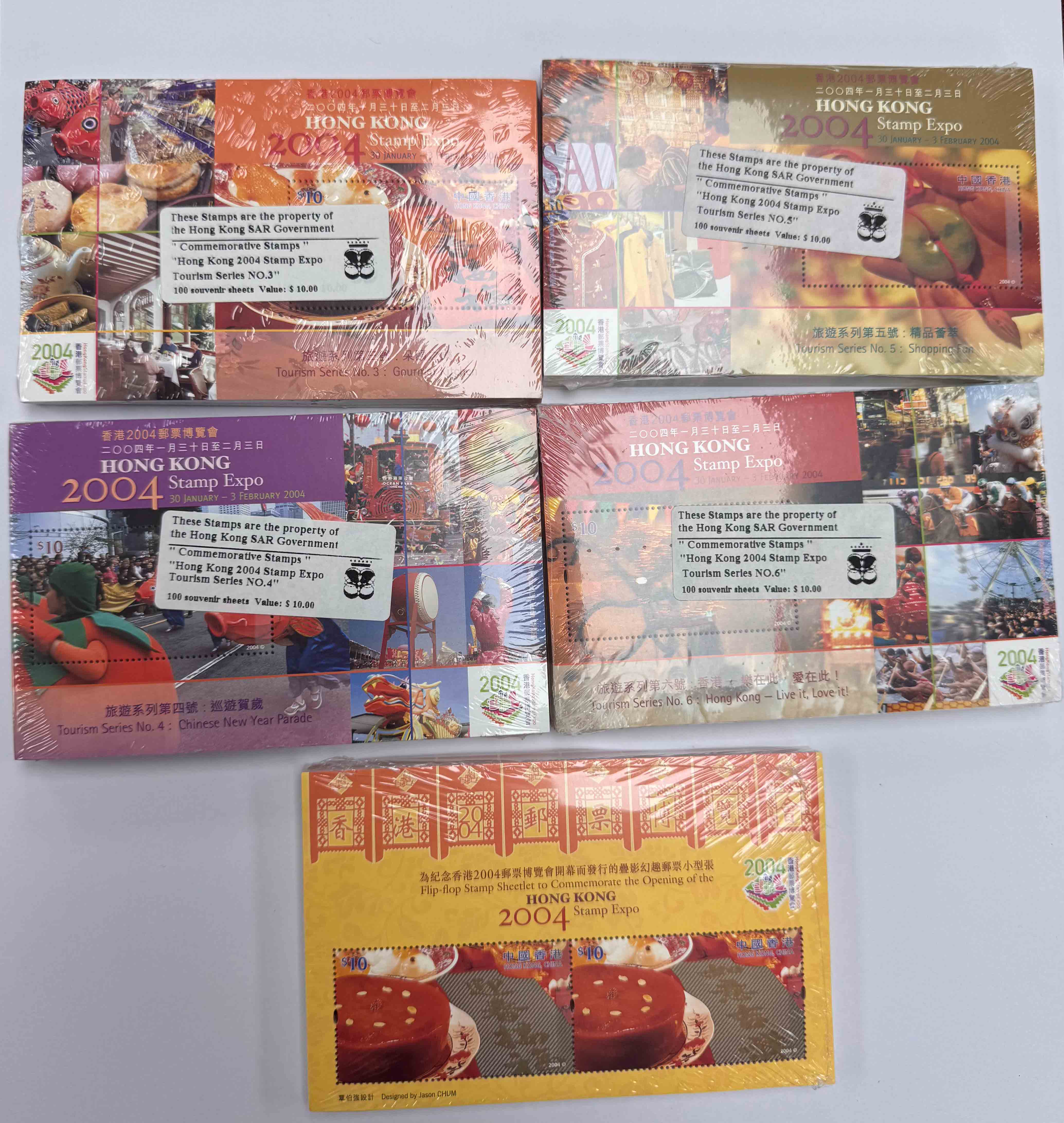 2004香港郵票博覽會旅遊系列10元面值第三、四、五、六號及開幕紀念20元面值小型張各100枚,總面值約$6,000。