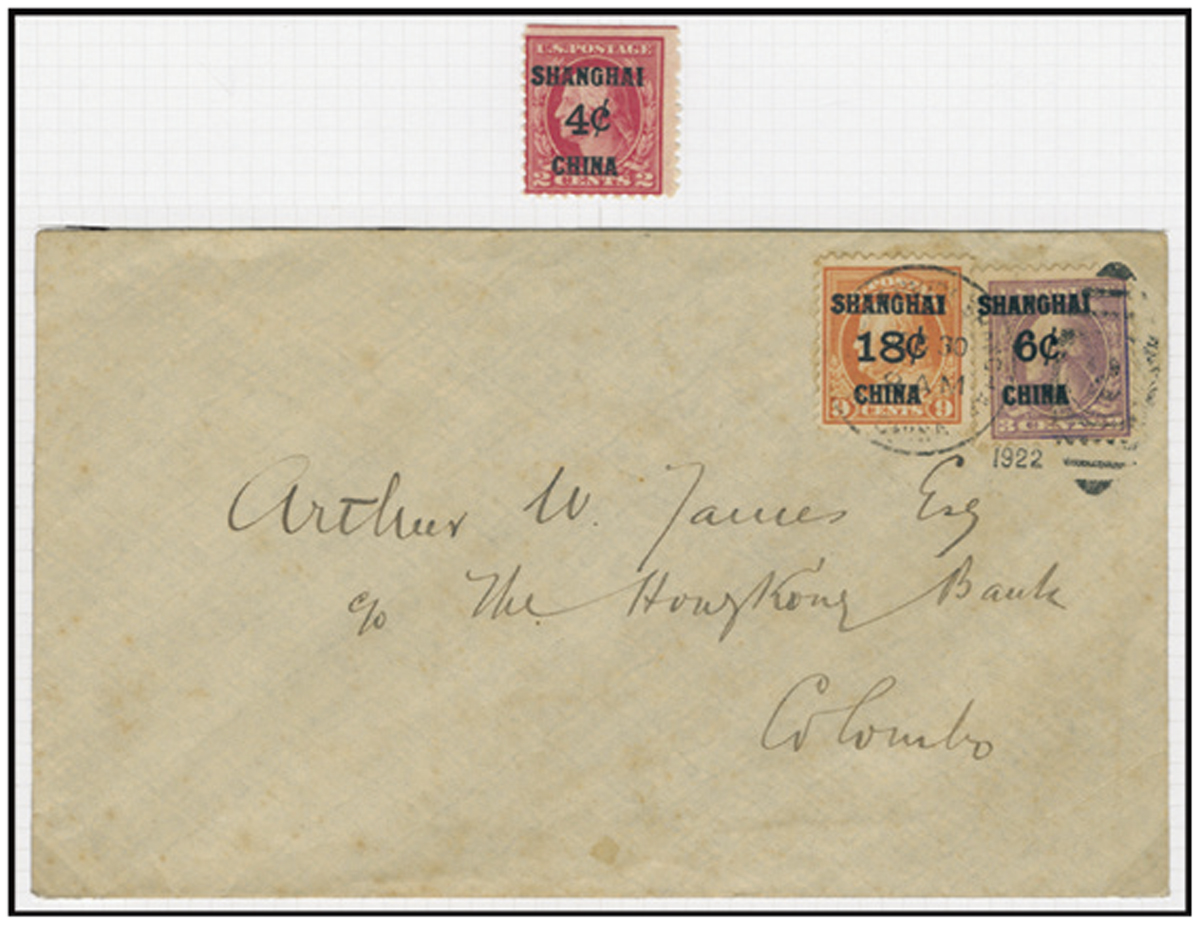 f.w. U.S. Shanghai surch. 18c on 9c & 6c on 3c stamps, canceled by Shanghai U.S. Postal Agency marking. Plus a 4c on 2c stamp. VF-F.