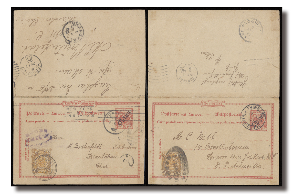 uprated by CIP 1c, German card tied by Tsingtau, Kiaochow cds., CIP 1c tied by IPO oval Kiaochow PO datestamp, on reverse with Yokohama transit cds and New York arrival mark. Reply portion German postage tied by Yonkers cds., CIP 1c tied by Shanghai LPO cds., along with New York datestamp and oval Kiaochow IPO datestamp, on reverse showing Vancouver and Shanghai Br. PO transit cds. Extremely rare double card used on both sides and still attached, especially the China related item. VF.