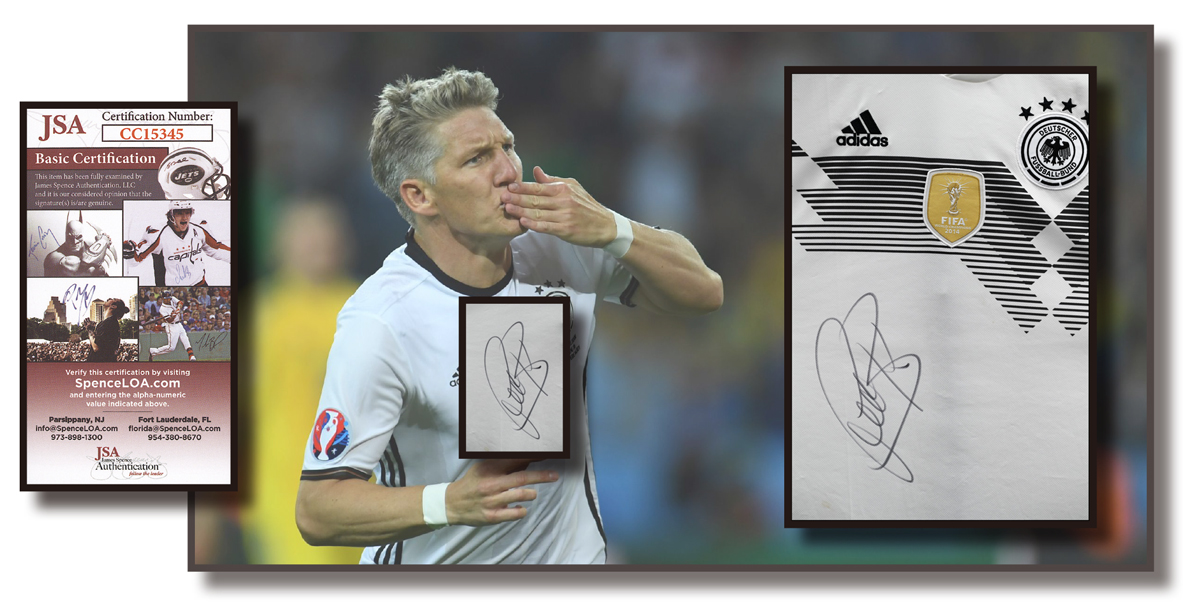 Bastian Schweinsteiger signed Germany National Team Jersey, JSA COA, XL size, new with tags (have small pale-yellow stain on jersey front, but not affecting the autograph)