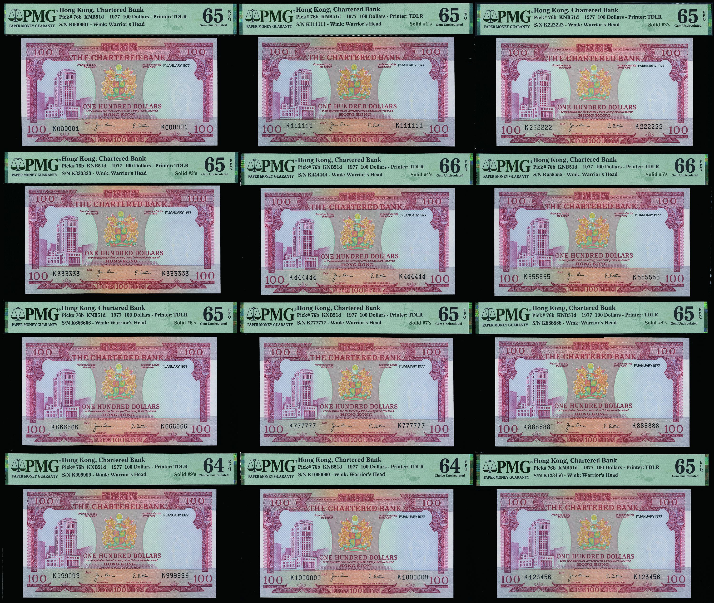 1977 $100 x 12 (KNB51d), all under same Prefix K and with fantastic lucky or solid serial nos.: 000001, 111111, 2222222, 333333, 444444, 555555, 666666, 777777, 888888, 999999, 1000000 and 123456. An incredible set of lucky number notes under same Prefix. Highly sought after for all serious collectors.