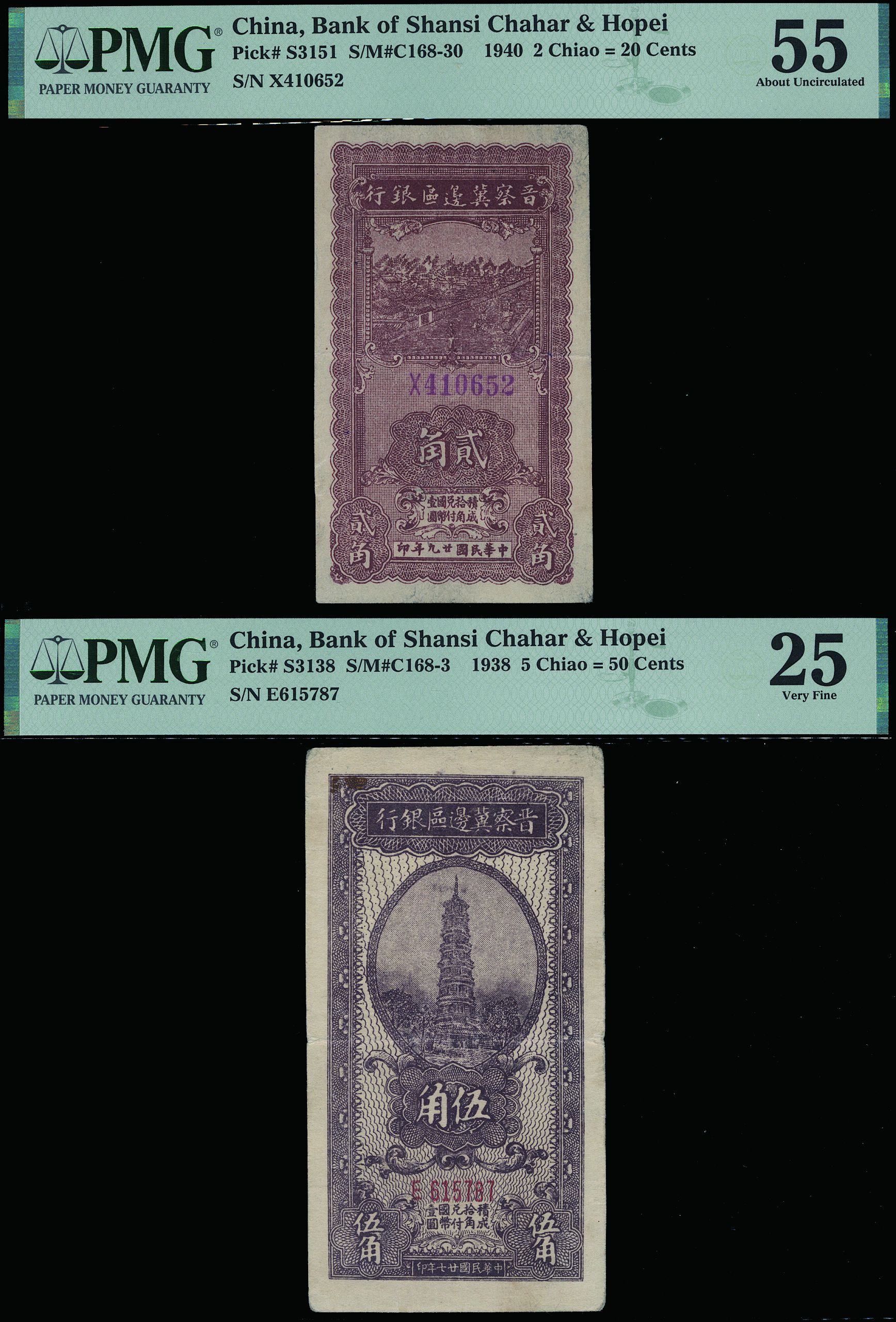 1938 5 Chiao & 1940 2 Chiao (P-S3138, S3151), serial nos.: E615787 & X410652, graded PMG25 & 55 respectively.