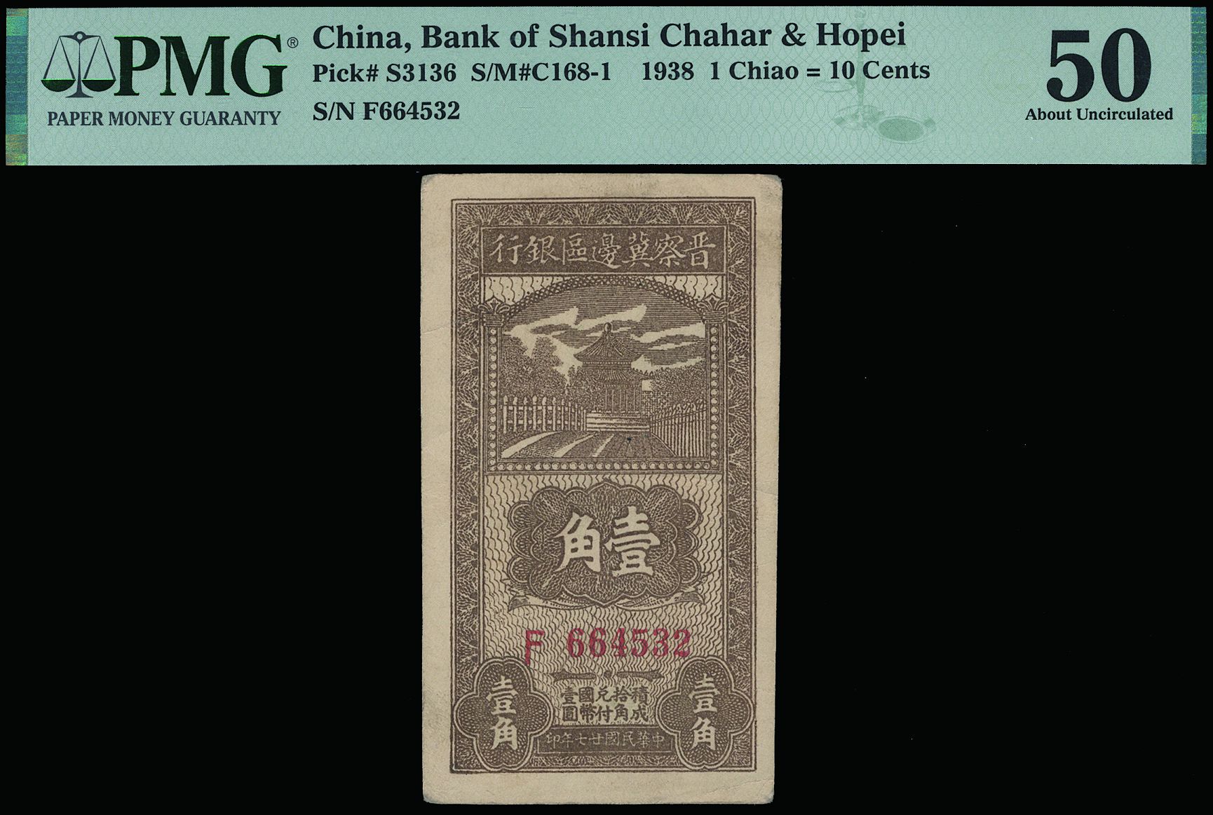 1938 1 Chiao (P-S3136), serial no.: F664532. About UNC. PMG50.