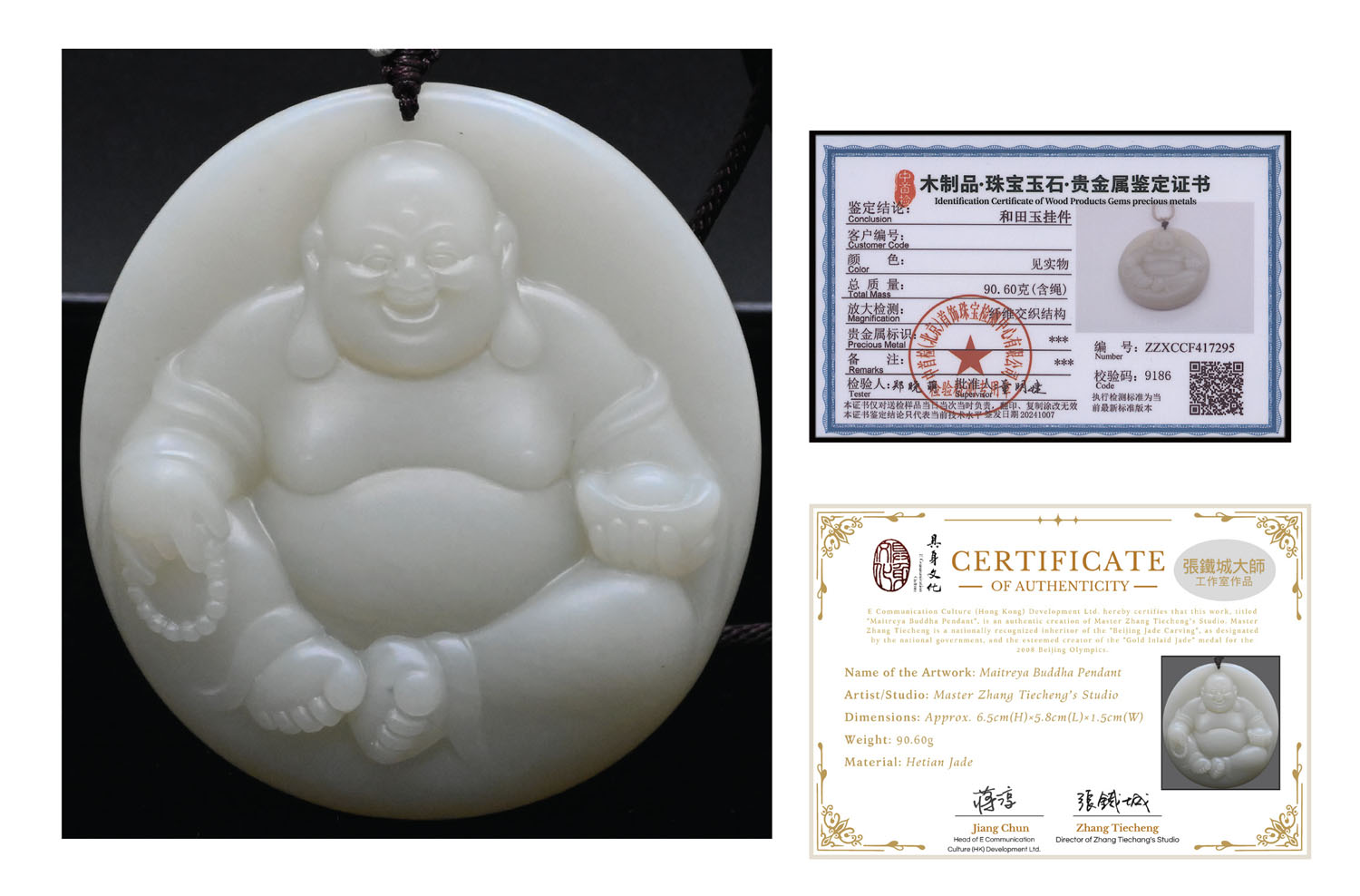 - Description: Representing future Buddha in Buddhism, Maitreya’s joyful, open-hearted figure which is "A big belly can accommodate everything in the world" promotes goodwill, optimism, and fortune. From ancient times to the present, he has always been widely worshiped by Chinese folk believers. This piece, crafted from Hetian Light Greenish White Jade, mirrors the smooth, rounded contours typical of Qing dynasty palace jade craftsmanship. Maitreya’s joyful expression and refined details convey serenity and an elegant simplicity. Please view carefully. Sold As Is. No Return.