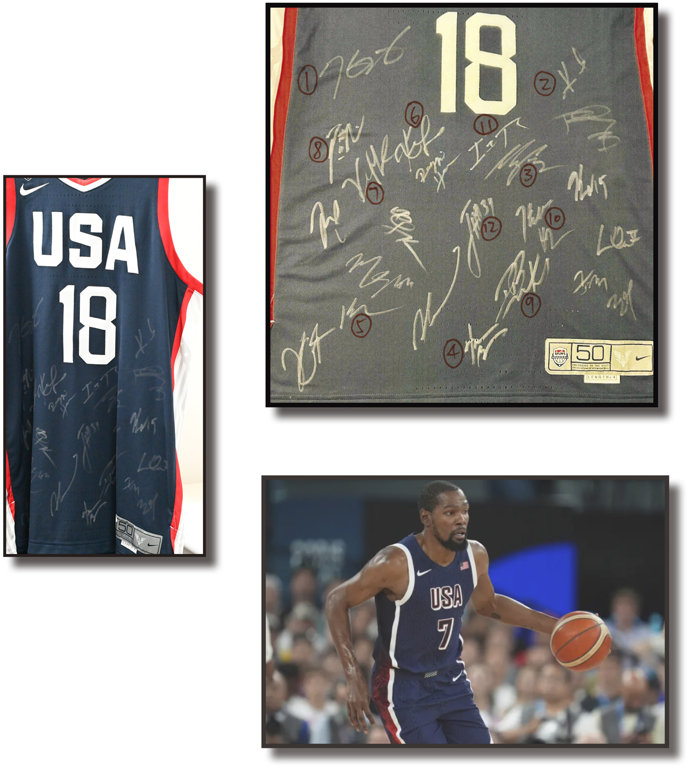 The jersey features 22 autographs of the NBA stars, and the JSA has verified and confirmed the signatures of 12 stars (with LOA). The player list is as follows:1. Kevin Durant (Four-time Olympic gold medalist in men's basketball (2012, 2016, 2020, and 2024), member of the 2010 FIBA World Championship team, two-time NBA champion and Finals MVP (2017 and 2018), 2012 and 2019 NBA All-Star Game MVP)2. Kyrie Irving (2016 Olympic gold medalist in men's basketball, member of the 2014 FIBA World Championship team, 2016 NBA champion, 2014 NBA All-Star Game MVP)3. Klay Thompson (2016 Olympic gold medalist in men's basketball, FIBA...)4. Harrison Barnes (2016 Olympic Men's Basketball Gold Medal, 2015 NBA Champion)5. Kyle Lowry (2016 Olympic Men's Basketball Gold Medal, 2019 NBA Champion)6. Kevin Love (2012 Olympic Men's Basketball Gold Medal, member of the 2010 FIBA Men's Basketball World Championship Team, 2016 NBA Champion)7. Khris Middleton (2020 Olympic Men's Basketball Gold Medal, 2021 NBA Champion)8. Damian Lillard (2020 Olympic Men's Basketball Gold Medal, two-time NBA Three-Point Contest Champion (2023 & 2024), 2024 NBA All-Star Game MVP)9. Devin Booker (two-time Olympic Men's Basketball Gold Medalists, 2020 & 2024, 2018)10. John Wall (2014 NBA Slam Dunk Contest Champion)11. Isaiah Thomas (Two-time NBA All-Star, 2016 & 2017)12. Tobias Harris (Philadelphia 76ers star)A fascinating and rare collectible item from the US Men's Basketball/NBA history collection!