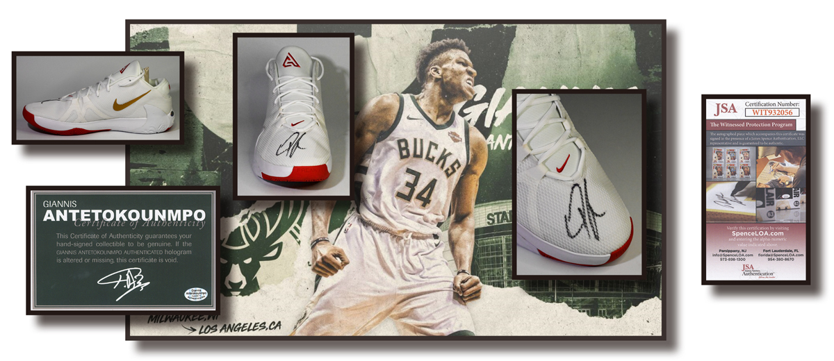 「字母哥」親筆簽名首款個人品牌球鞋「Freak 1」 (右鞋一隻),全新,雙重認證(JSA 基本證書、Beckett 網上核證 )。球鞋為US17碼,亦即「字母哥」本人的球鞋尺寸(Bucks@Twitter, 18.2.2019)「字母哥」- 2021 NBA總冠軍暨總決賽最有價值球員、2 x NBA 常規賽最有價值球員 (2019 及2020)。