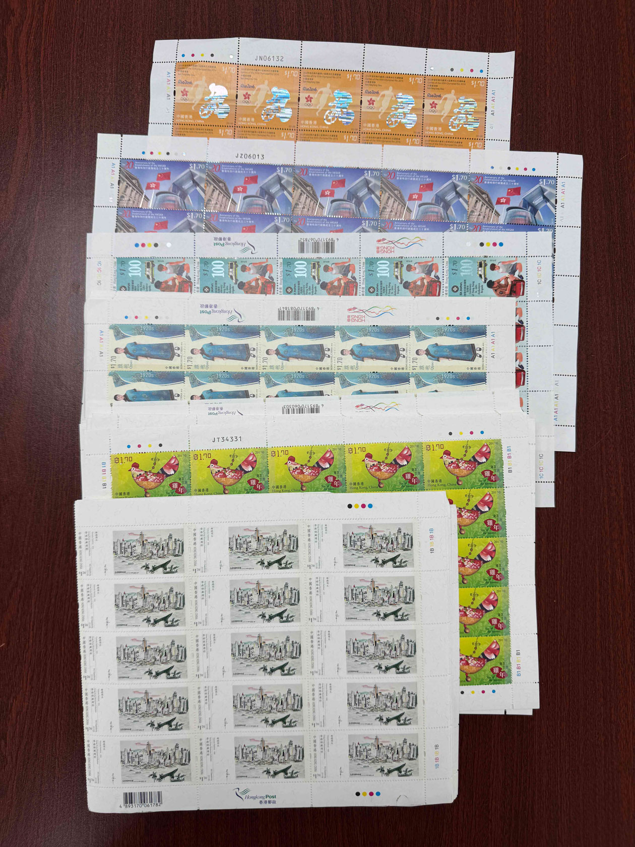 一批香港寄信版票,單枚面值1.7元,25枚一版,共144版,總面值約$6,120。