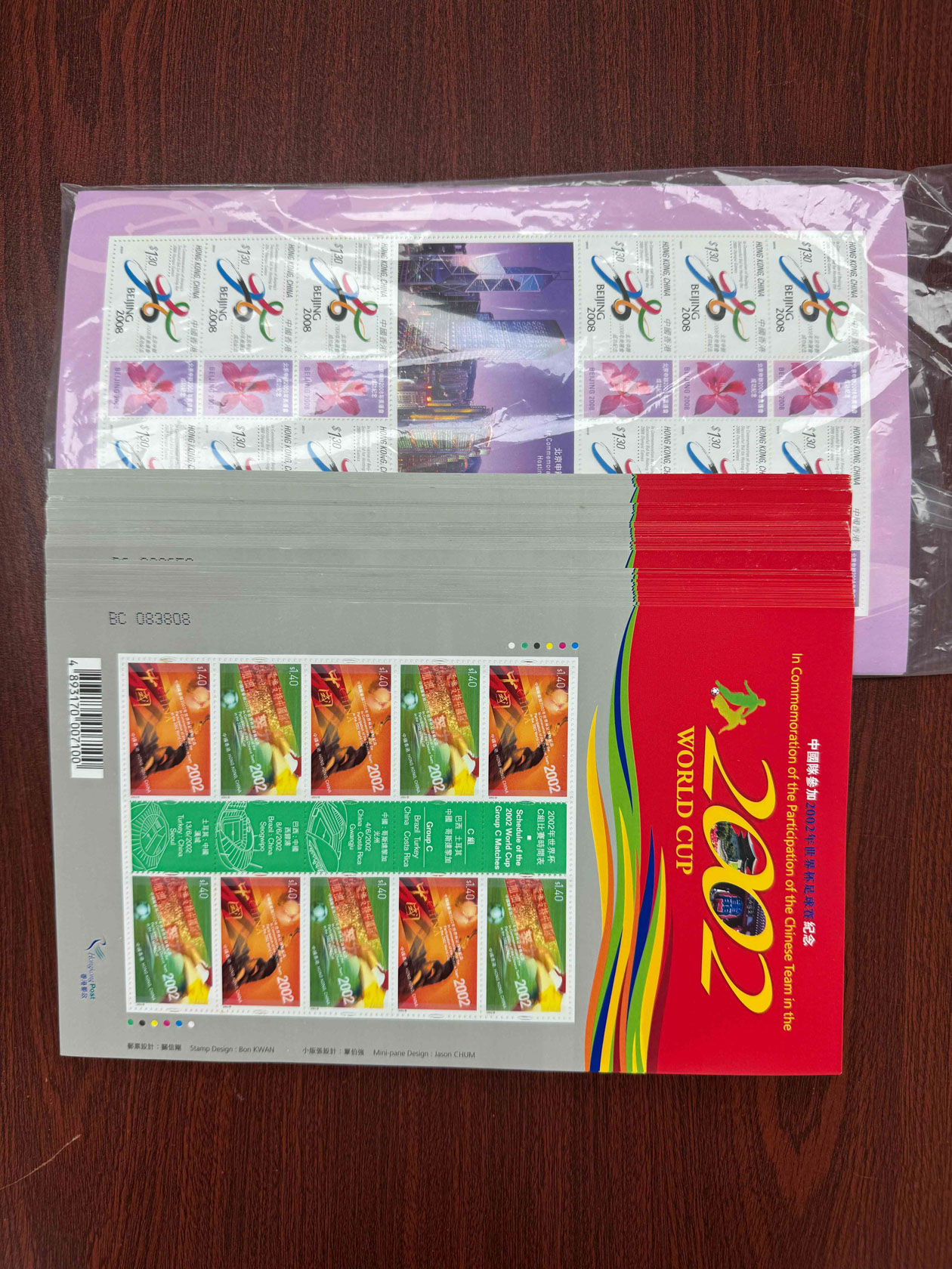 香港2008年北京申辦奧運成功紀念1.3元面值62版及世足賽1.4元面值62版,總面值約$1,835.20。