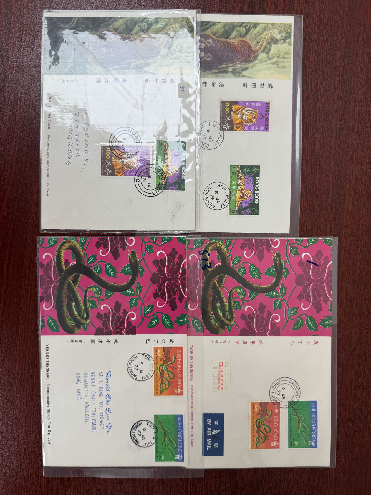including Year of Tiger x 2 colours and Year of Snake x 2 colours. Three of them addressed. Slighlty toned. VF-F.