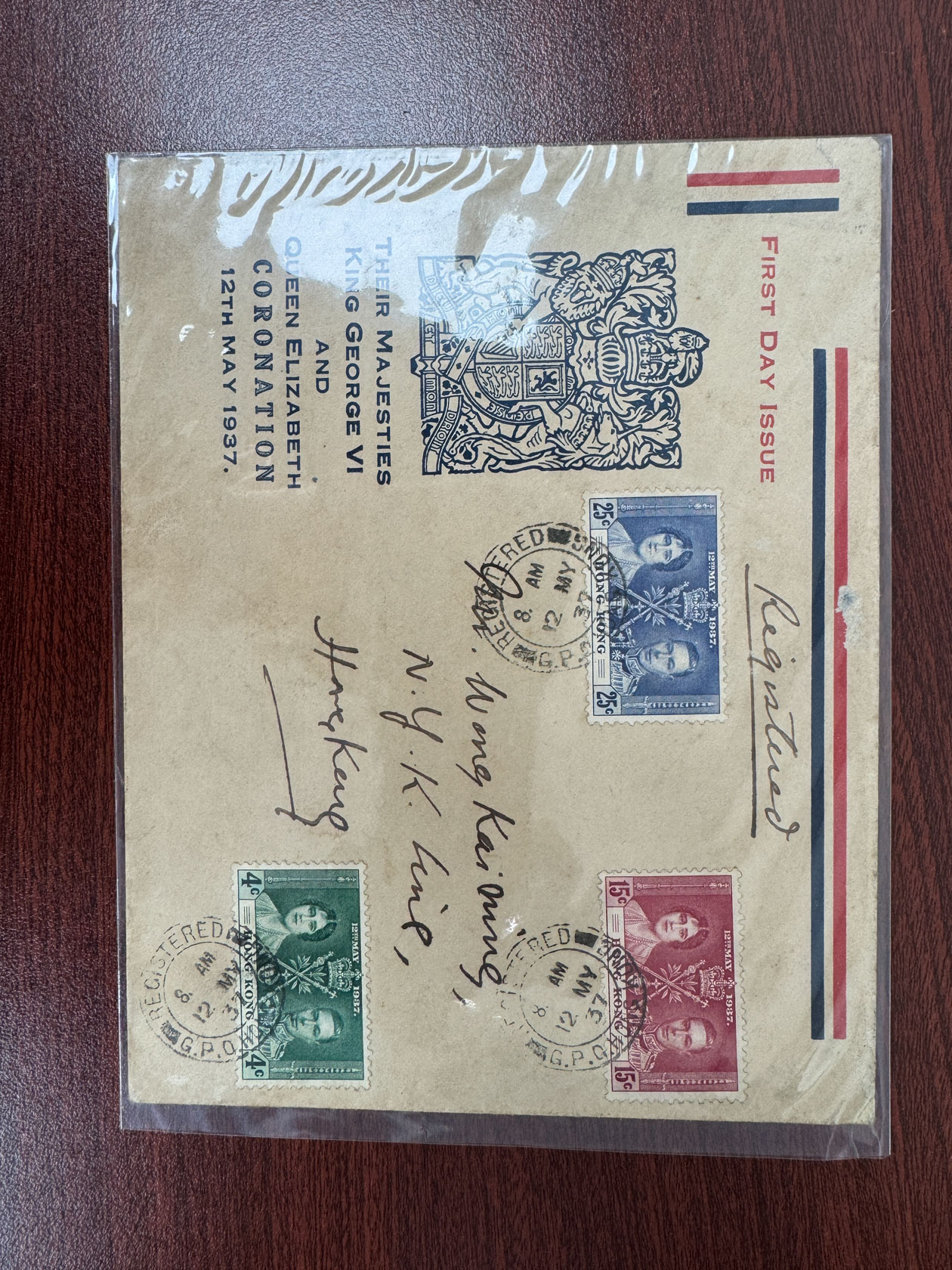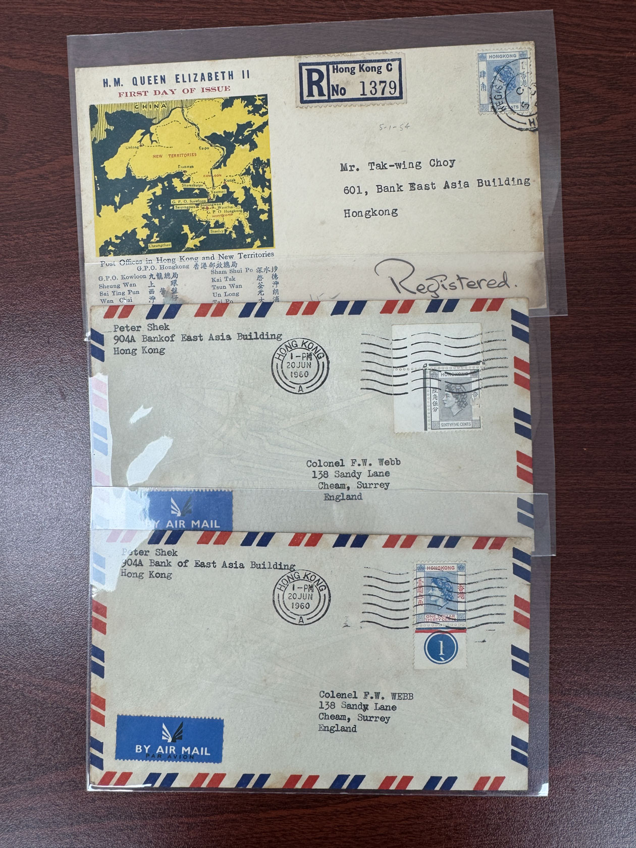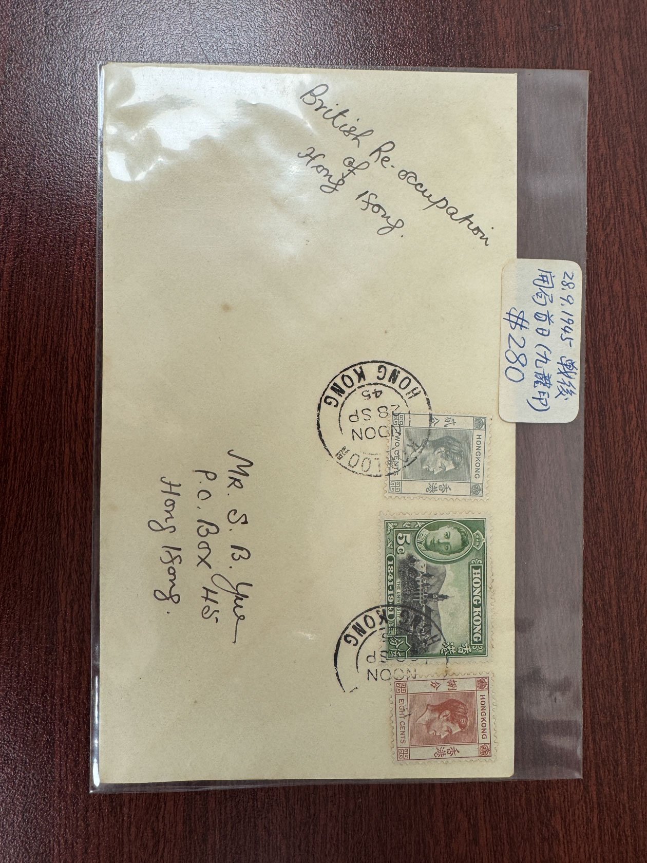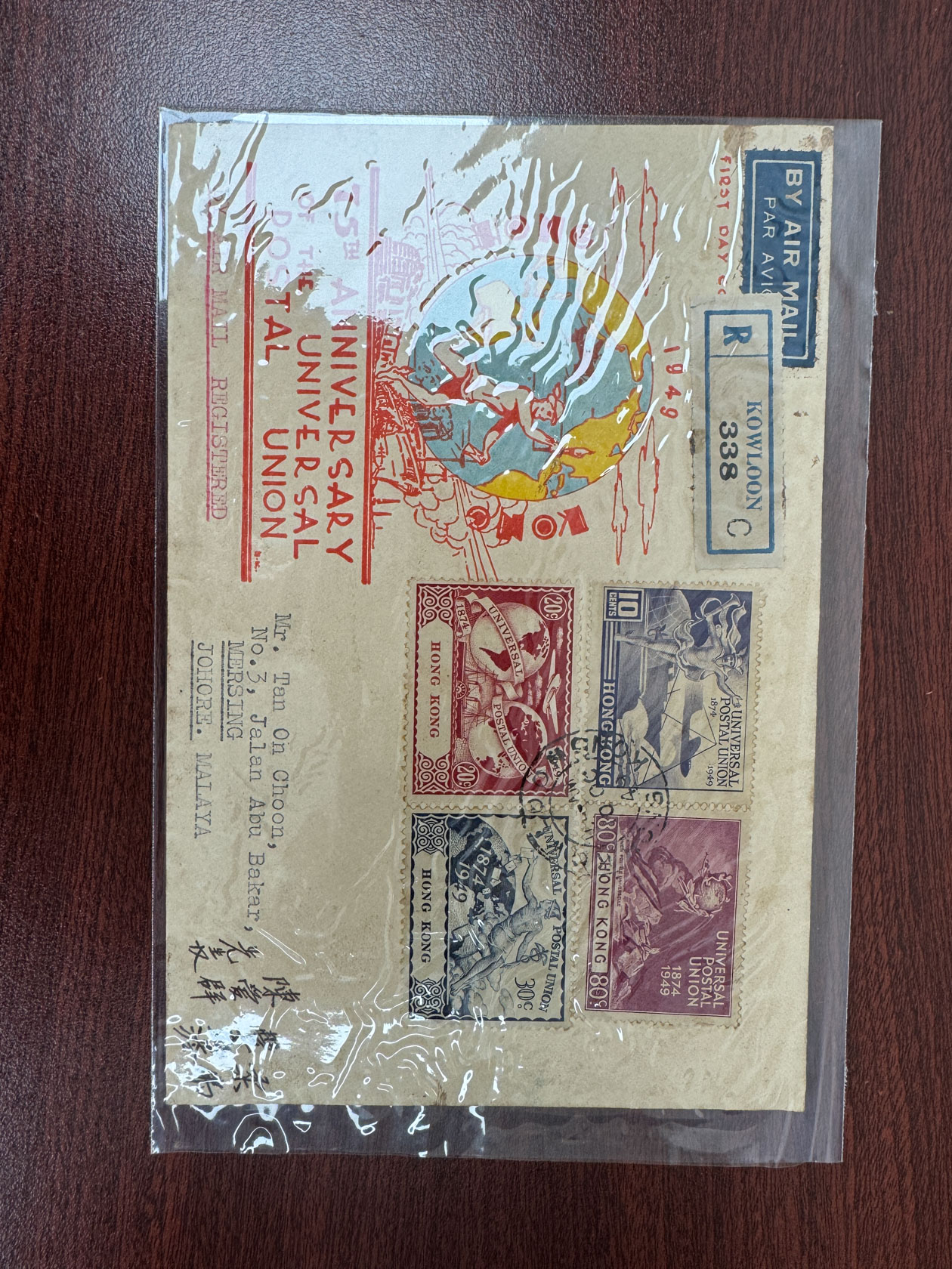 f.w. KGVI 2c, 8c and Centenary of British Occupation 5c, tied by Kowloon cds. VF-F.