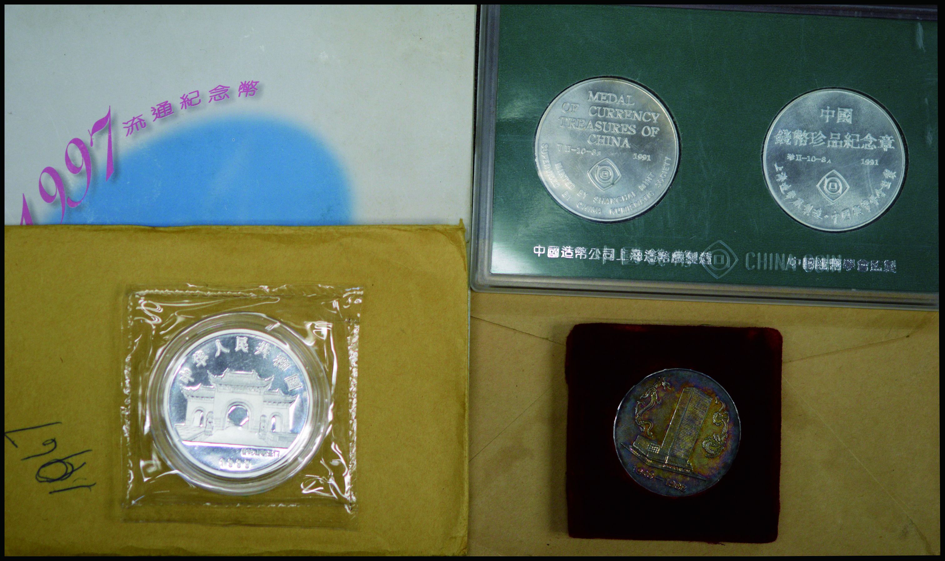 一小盒中國及世界錢幣和紀念章,包括有1991年中國錢幣珍品紀念章、1997年香港流通紀念幣套裝、1999年觀音1盎司銀幣、華潤公司成立40周年紀念章、兩盒日本紀念章和2套加拿大流通幣套裝等。請預覽樂。