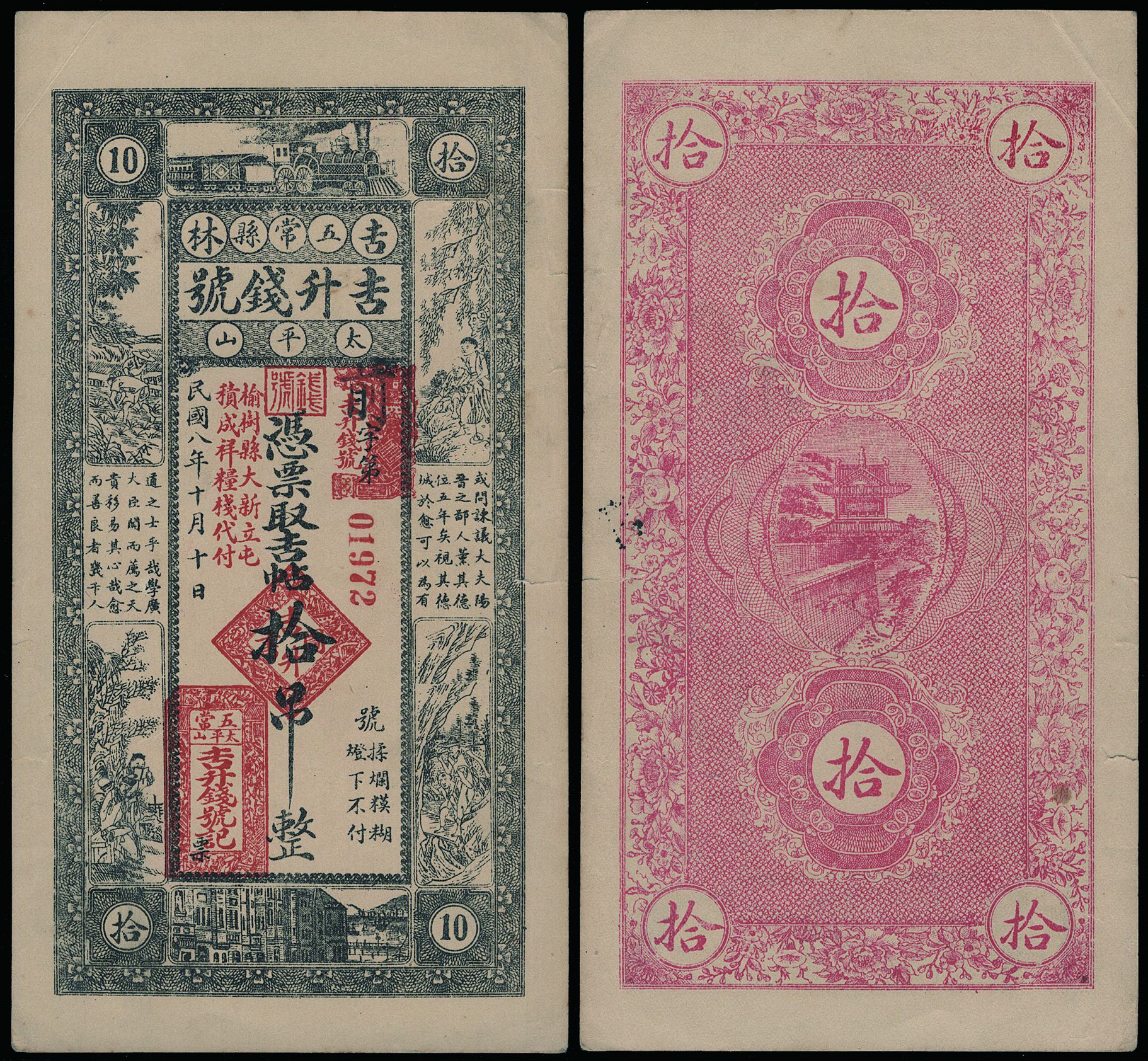 吉林五常縣太平山吉升錢號民國八年(1919年)10吊錢票。九品。