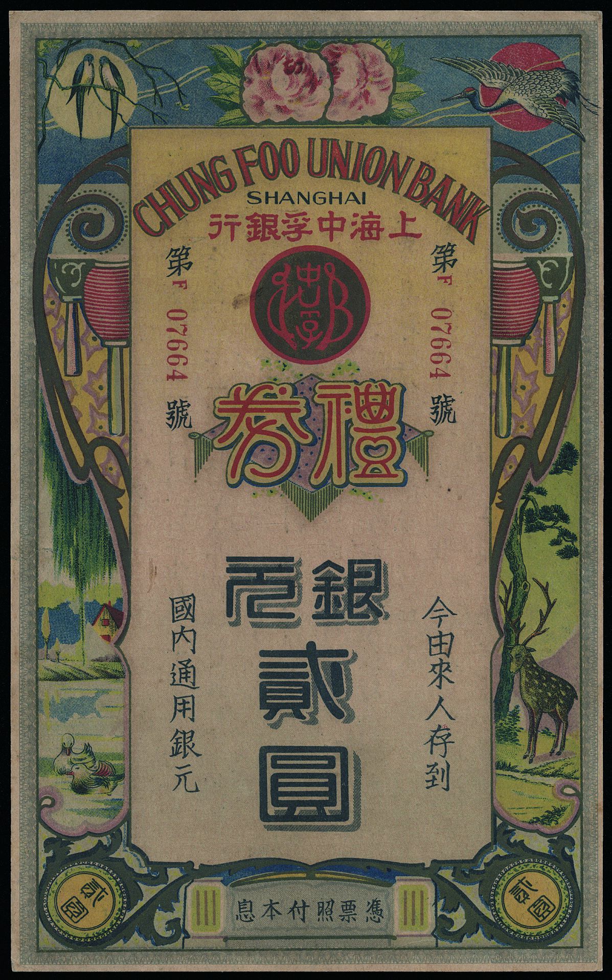 民國時期上海中孚銀行銀元2元禮券。
