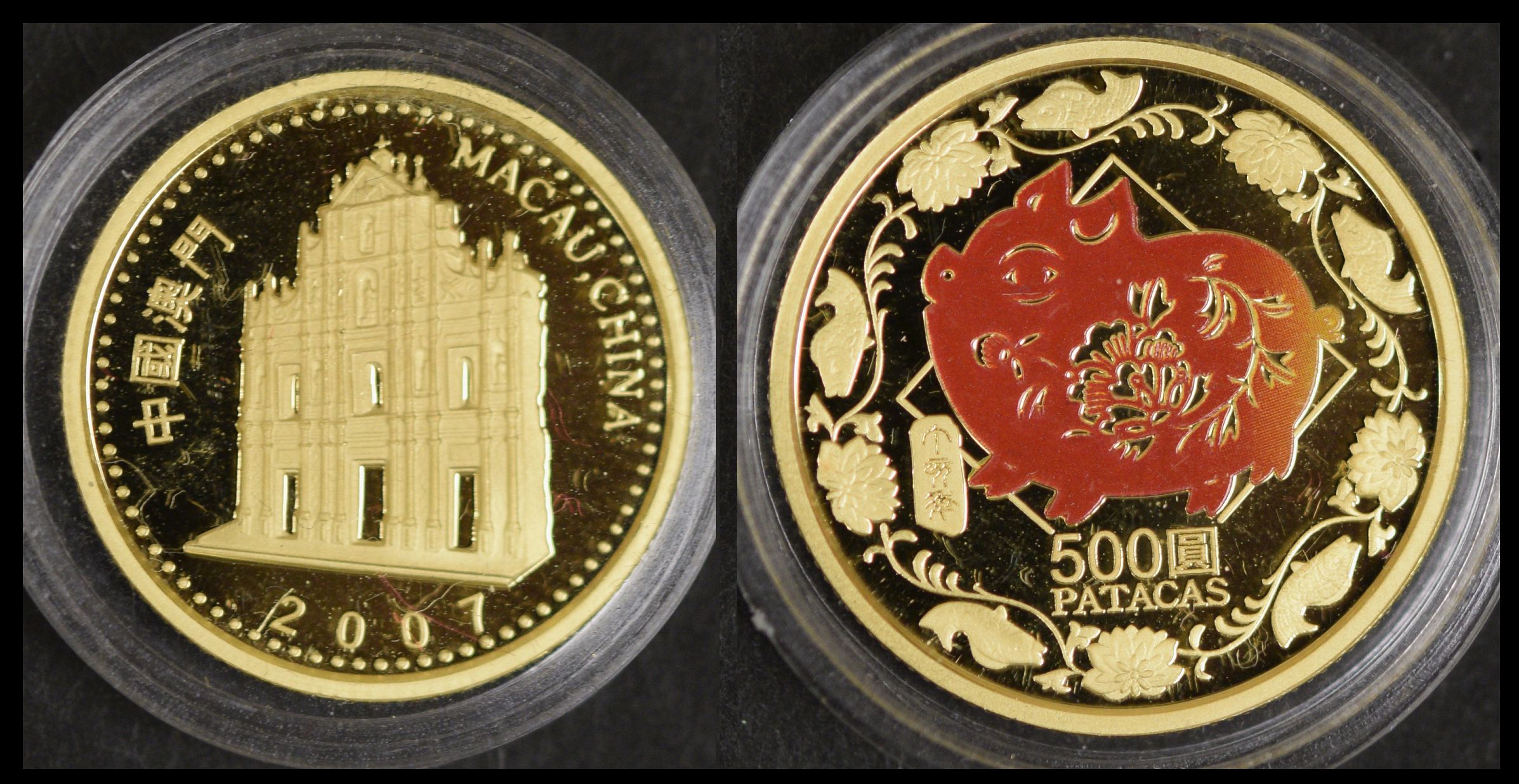 2007 Macau Year of the Pig 500 Patacas 8g proof gold coin,