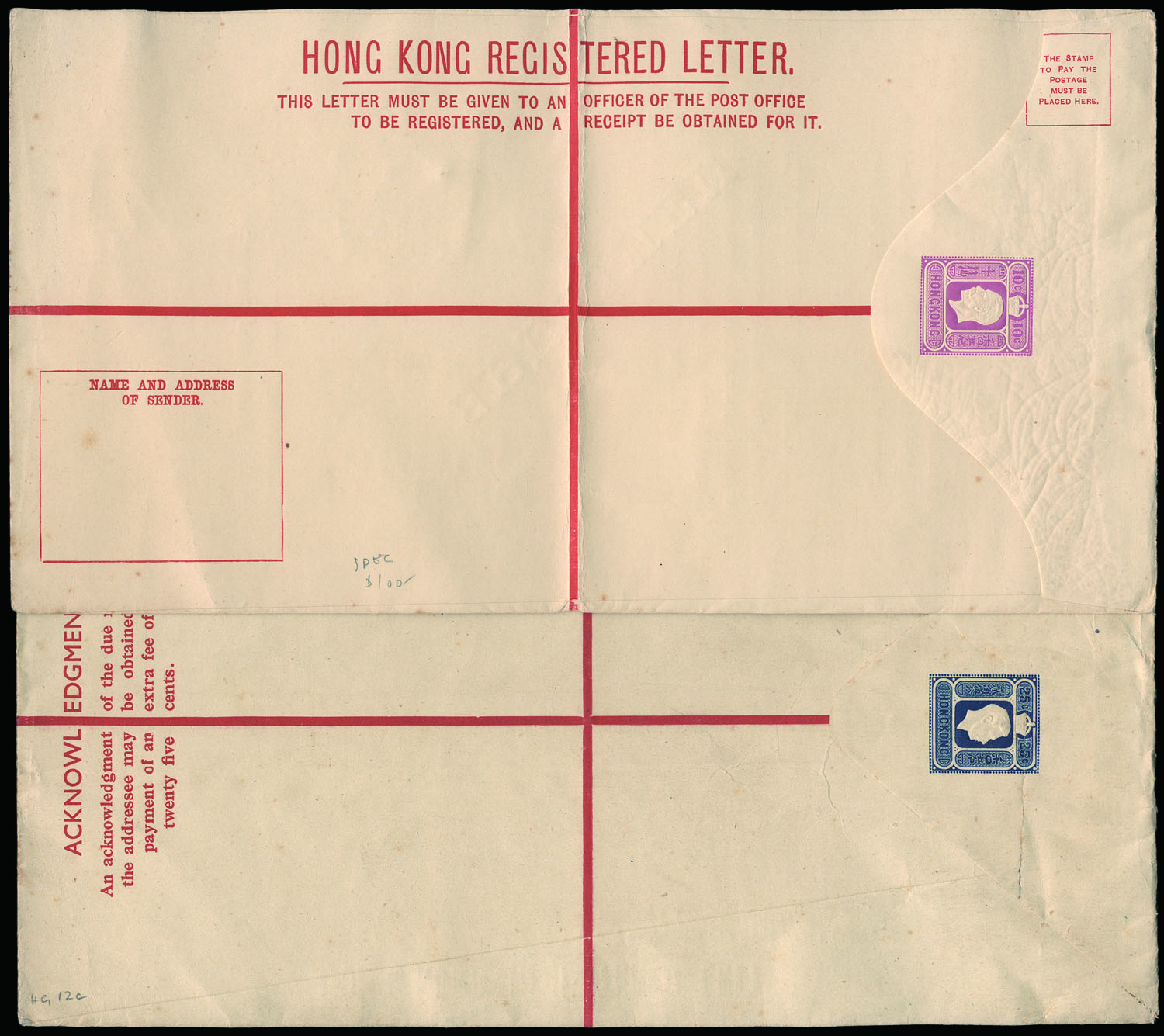 uprated by KEVII 4c, tied by Hong Kong Registered cds., with London arrival cds. on reverse. VF-F.